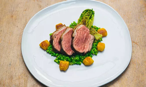 Roasted rack of lamb, soft herb and parmesan polenta, chargrilled courgette, petit pois.