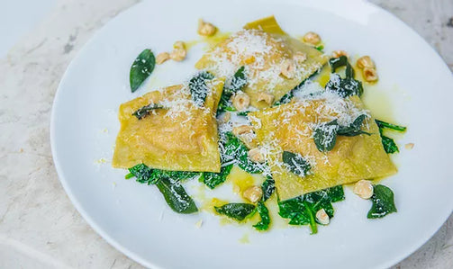 Pea, mint and ricotta ravioli, aged parmesan, extra virgin olive oil.