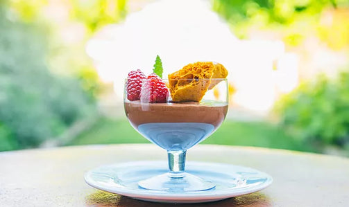 Vanilla panna cotta, fresh raspberries, oat and hazelnut crumble.